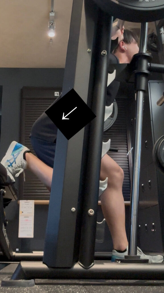 次に下げる時は下方向に下げるのではなくお尻側(大臀筋)に引くように下げてください。わかりにくいと思うので画像を貼っておきます。