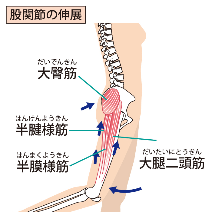 - 股関節伸展の主役を大臀筋が担う